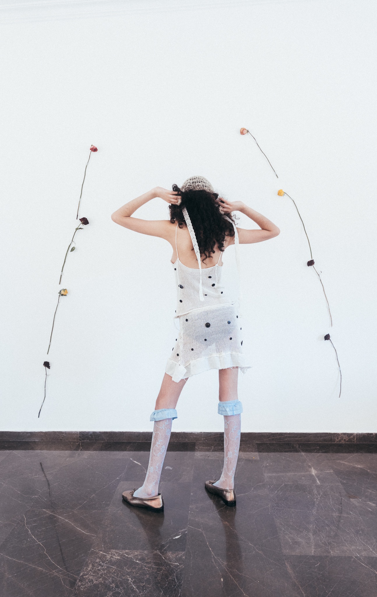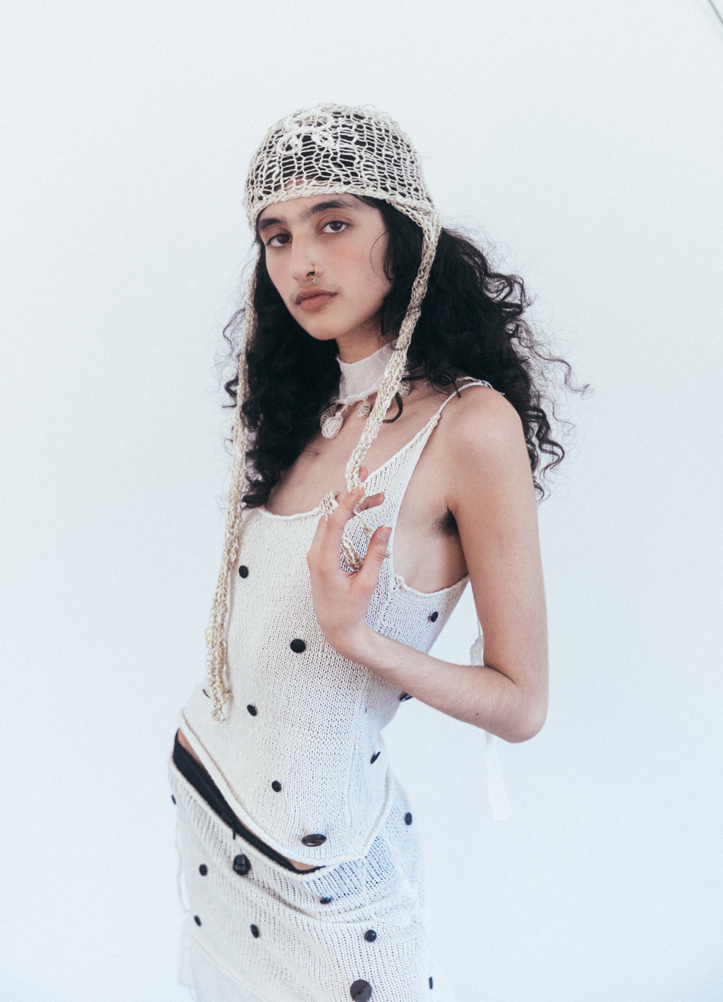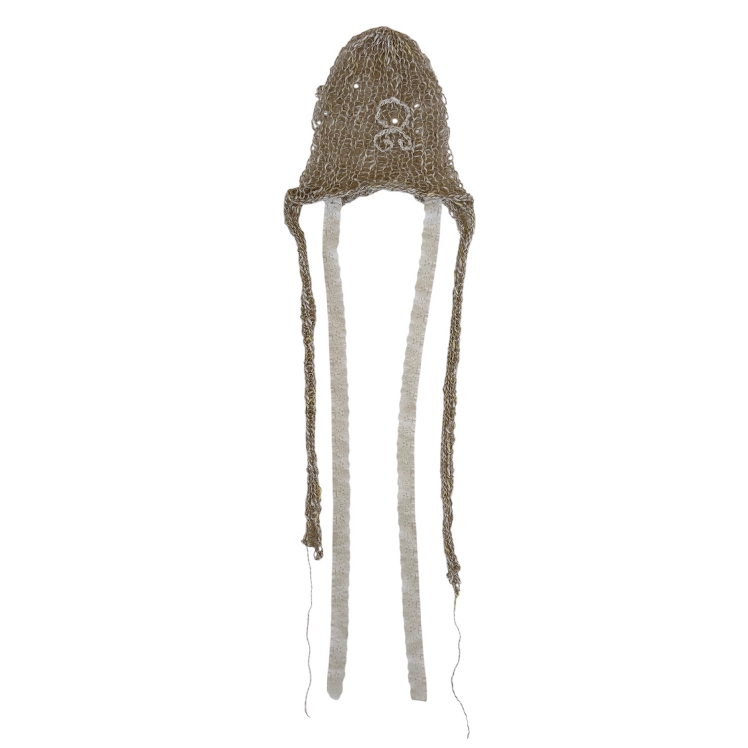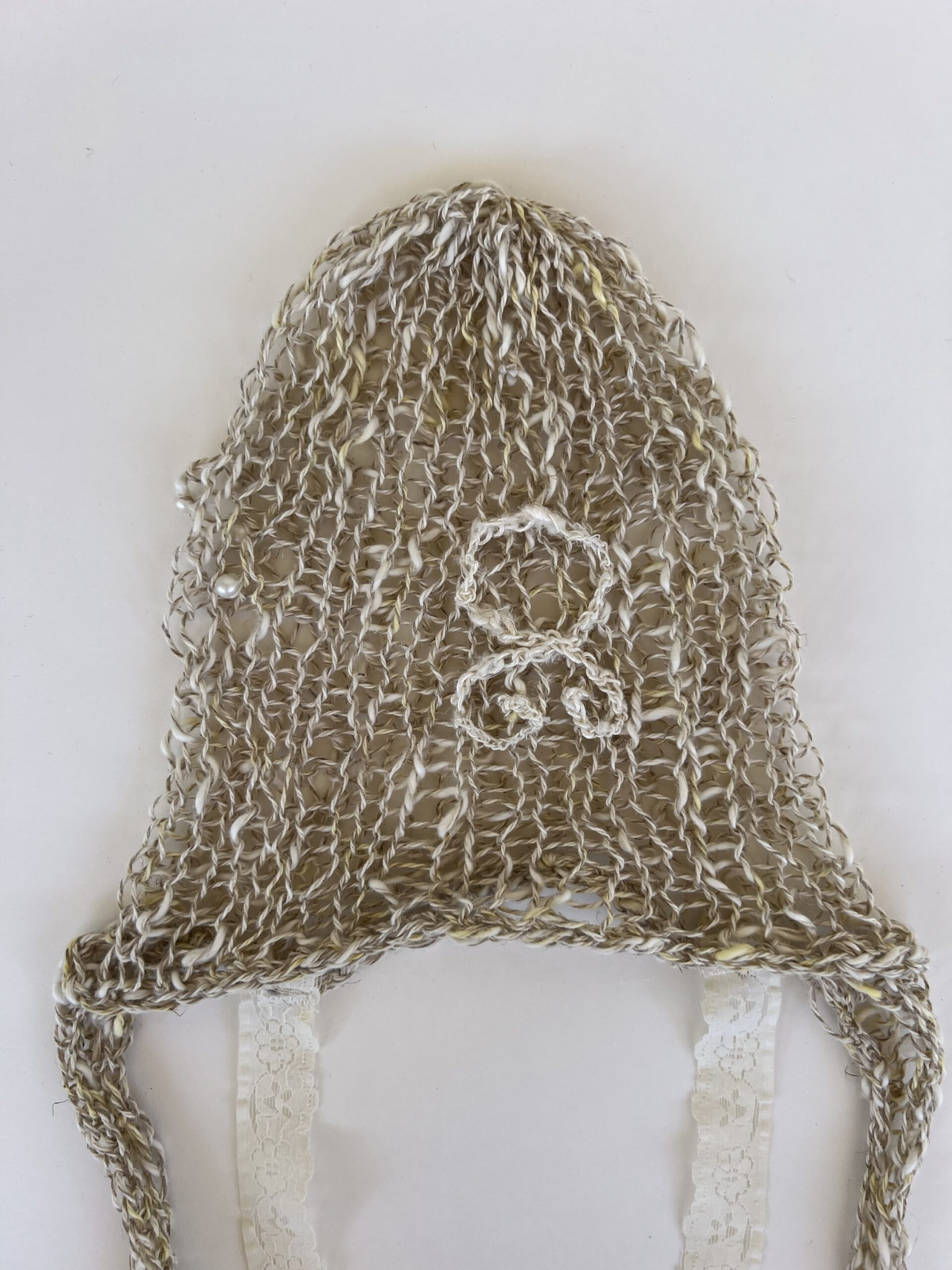 high priestess bonnet. with deadstock crepe lace attached, a trollkors in silk embroidered for protection and pearls. Knitted in linen yarn.